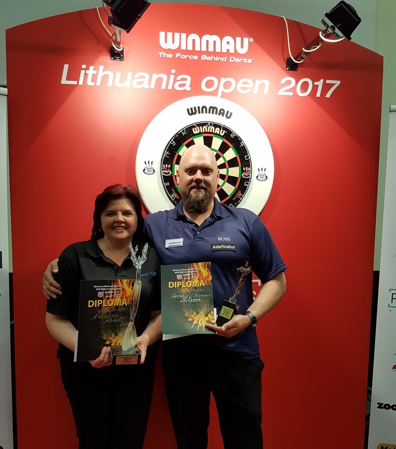 Lithuania Open was played 13/05/2017 in Hotel Panorama, Vilnius, Lithuania with 88 men, 28 women and 5 youth. In picture left women’s singles winner Amanda Abbott England (L) and men’s singles winner Dennis Nilsson Sweden (R). WDF Tables updated with these results 16/05/2017.